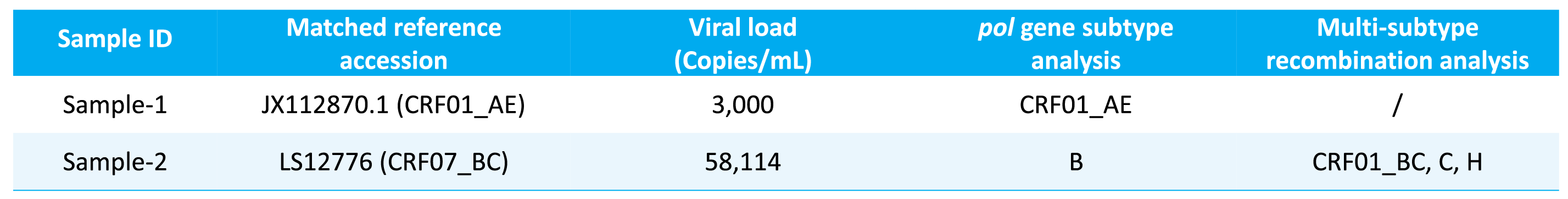 μCaler HIV-1 Whole-Genome Complete Testing Solution, combining full-length genome sequencing with pol gene analysis, has successfully identified multiple subtypes and CRFs, including: B, C, CRF01_AE, CRF07_BC, CRF08_BC, CRF55_01B, CRF59_01B, CRF65_cpx, CRF68_01B, and CRF85_BC. Subtype analysis was demonstrated using two clinically derived HIV nucleic acid samples (Table 2). The results showed that, for some samples, the subtype assignment based on the full-length genome sequence was inconsistent with the result based only on the pol gene. Such discrepancies typically suggest that the strain may be a multi-subtype recombinant virus.