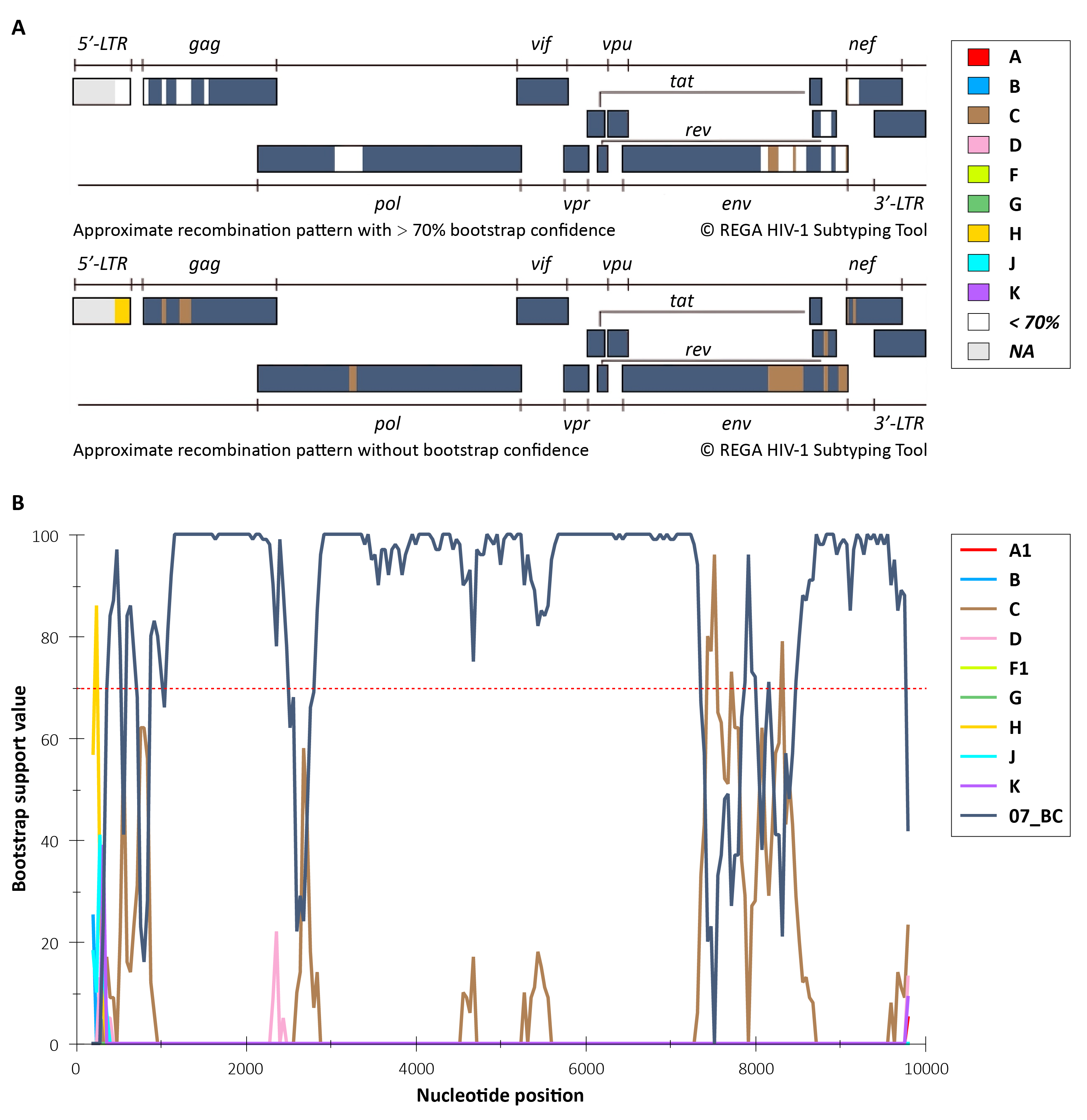 To further validate putative sites of recombination, aligned segments were then analyzed by REGA HIV-1 Subtyping Tool (Version 3.0) in Sample-2. The recombination pattern plot showed that this strain’s genome is formed by an alternating pattern of sequence segments derived from different parental subtypes. Bootscan analysis further confirmed that, across different genomic regions, the bootstrap values (breakpoints support value) for the strain relative to reference sequences of potential parental subtypes exhibited a clear change. The sites of specific breakpoints were highly consistent with the recombination breakpoints predicted in the pattern plot. The high bootstrap confidence observed in multiple regions (typically > 70%) statistically substantiated the subtype assignment of each genomic segment (Figure 4).